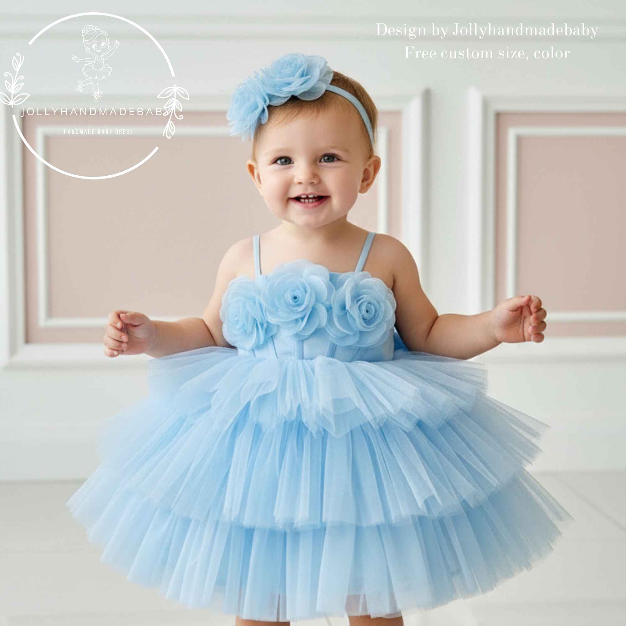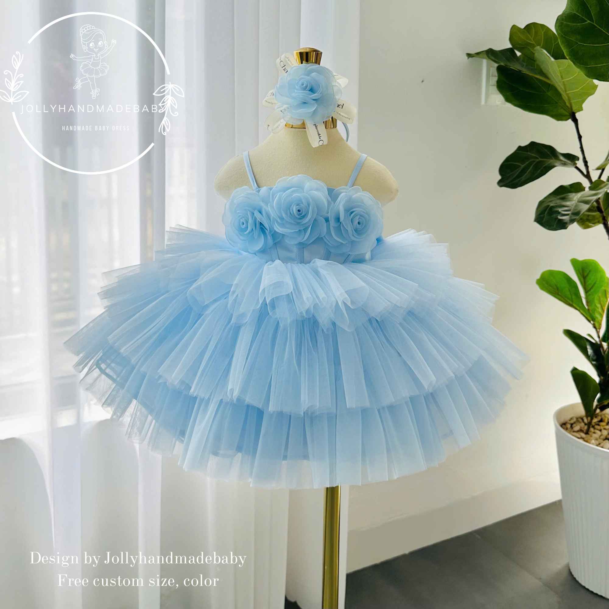 - Blue Flower Girl Dress, Baby Tutu Dress, Toddler Birthday Dress, 3D Rose Dress, Handmade Baby Girl Dress, Princess Tulle Dress
