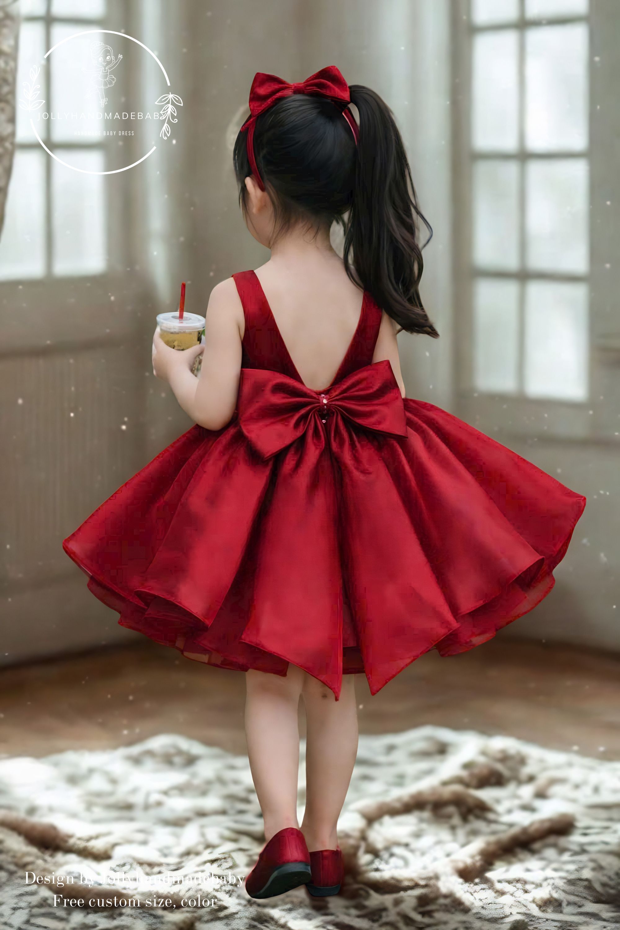 Bungunry Baby Girl Dress – Luxury Satin Tutu Dress with Big Bow Back, Flower Girl Dress, Birthday Party Dress, Handmade Custom Size