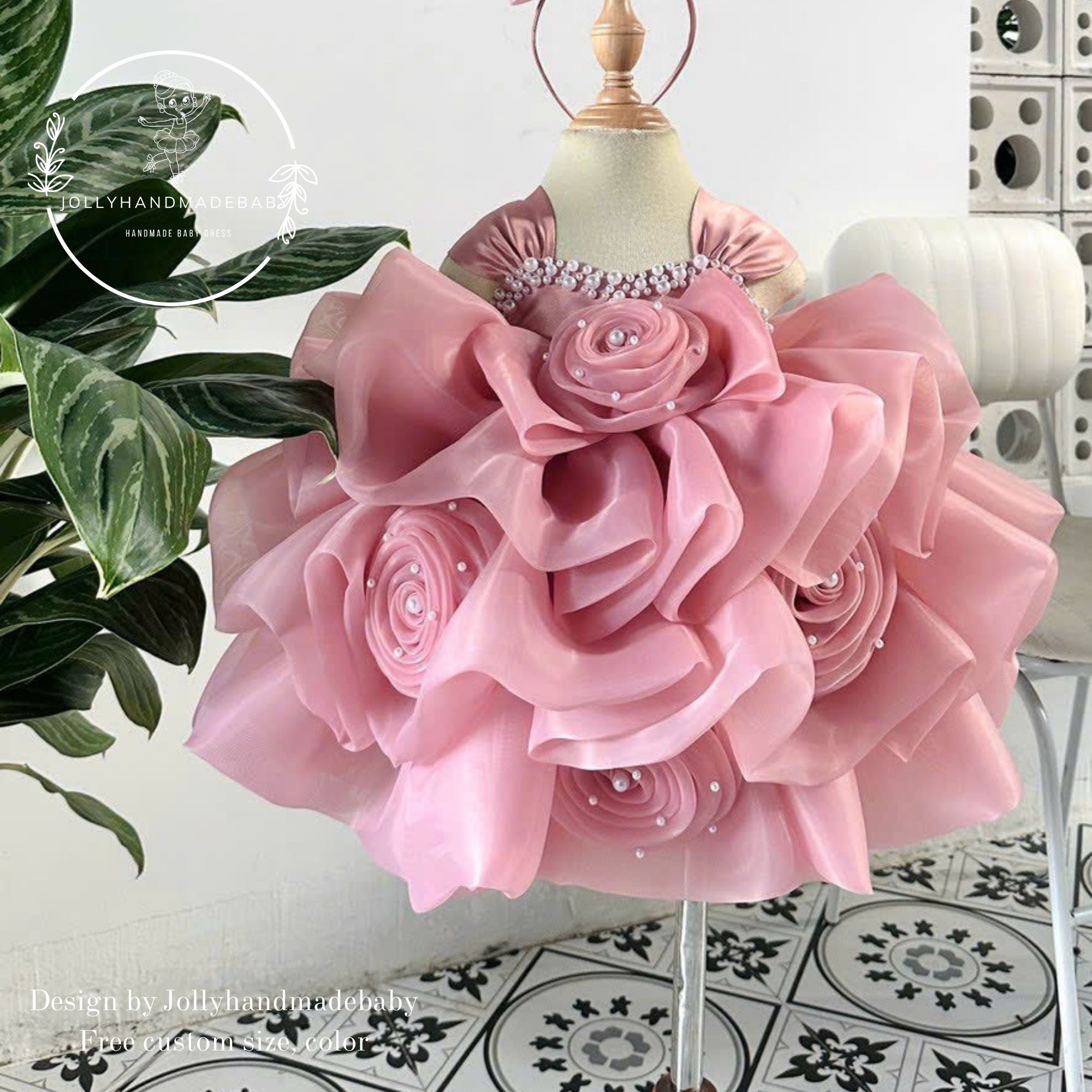 Handmade Dusty Rose Organza Girl Dress: Tulle Tutu, Pearls