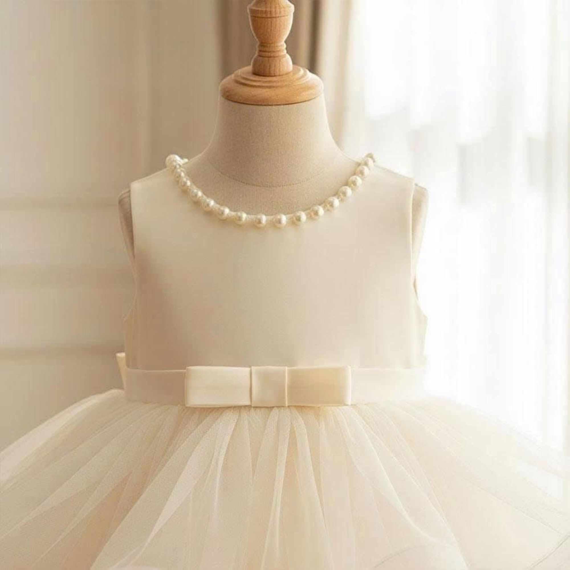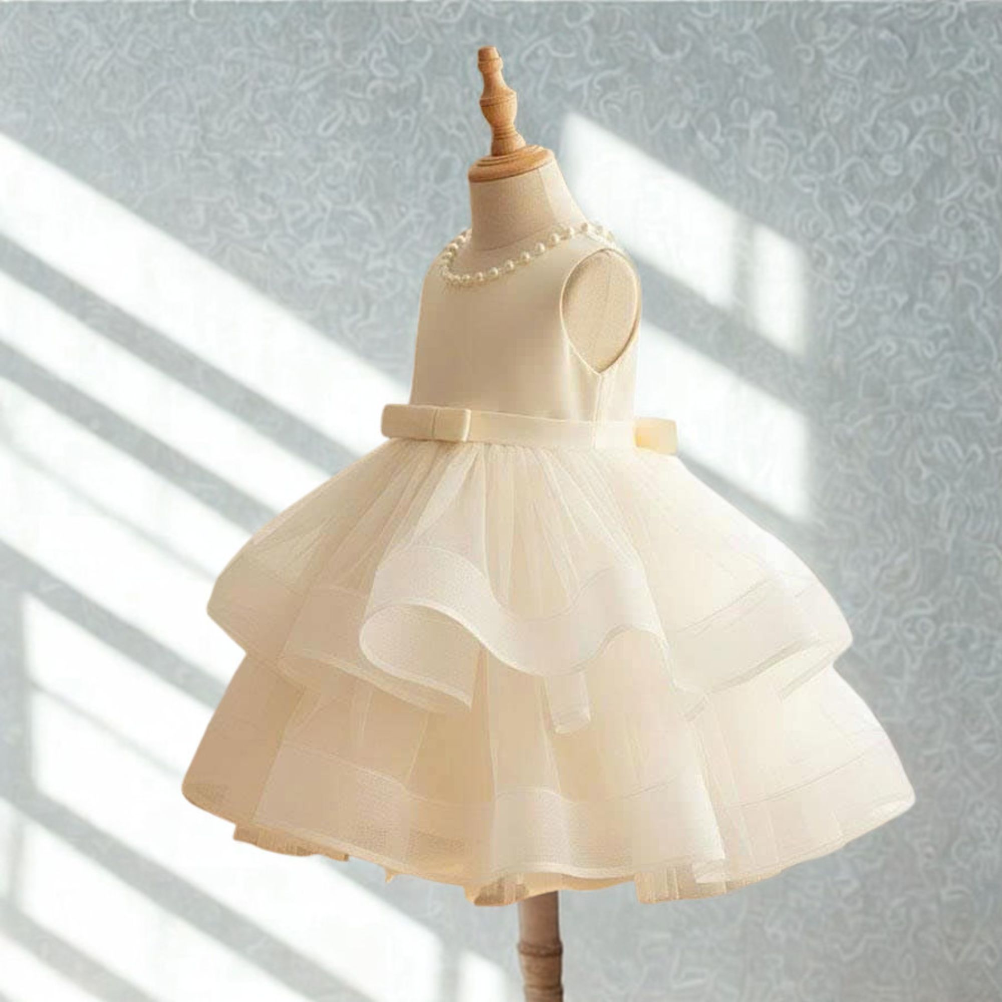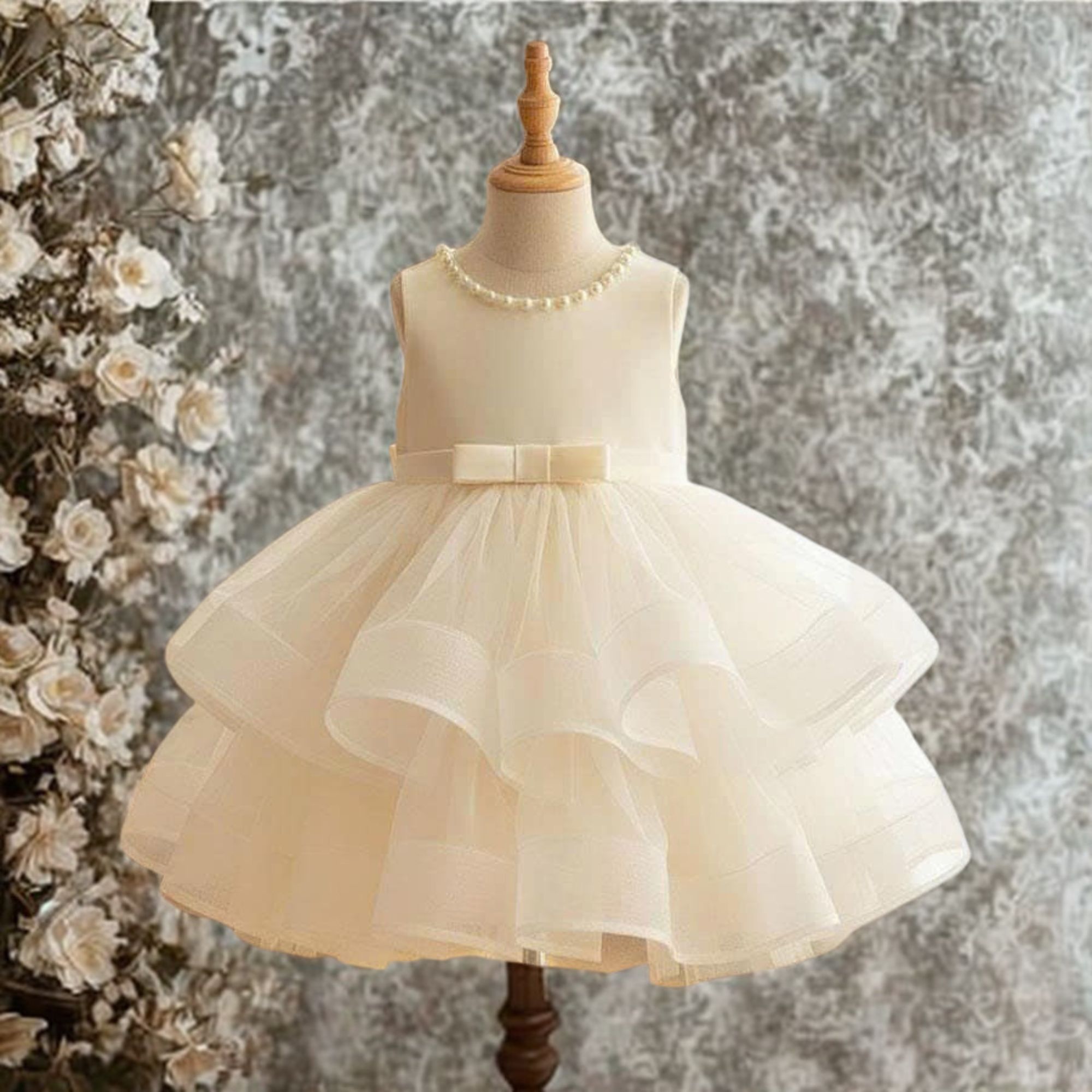 A timeless ivory baby girl dress, soft and elegant like a gentle whisper of light. Crafted with delicate layers of airy tulle, this dress creates a dreamy, voluminous silhouette perfect for your little princess. The handcrafted floral detail adds a romantic touch, while the oversized bow at the back brings graceful charm from every angle. Ideal for weddings, birthdays, and special occasions, this dress is designed to make every moment unforgettable. Custom size and color available for the perfect fit.