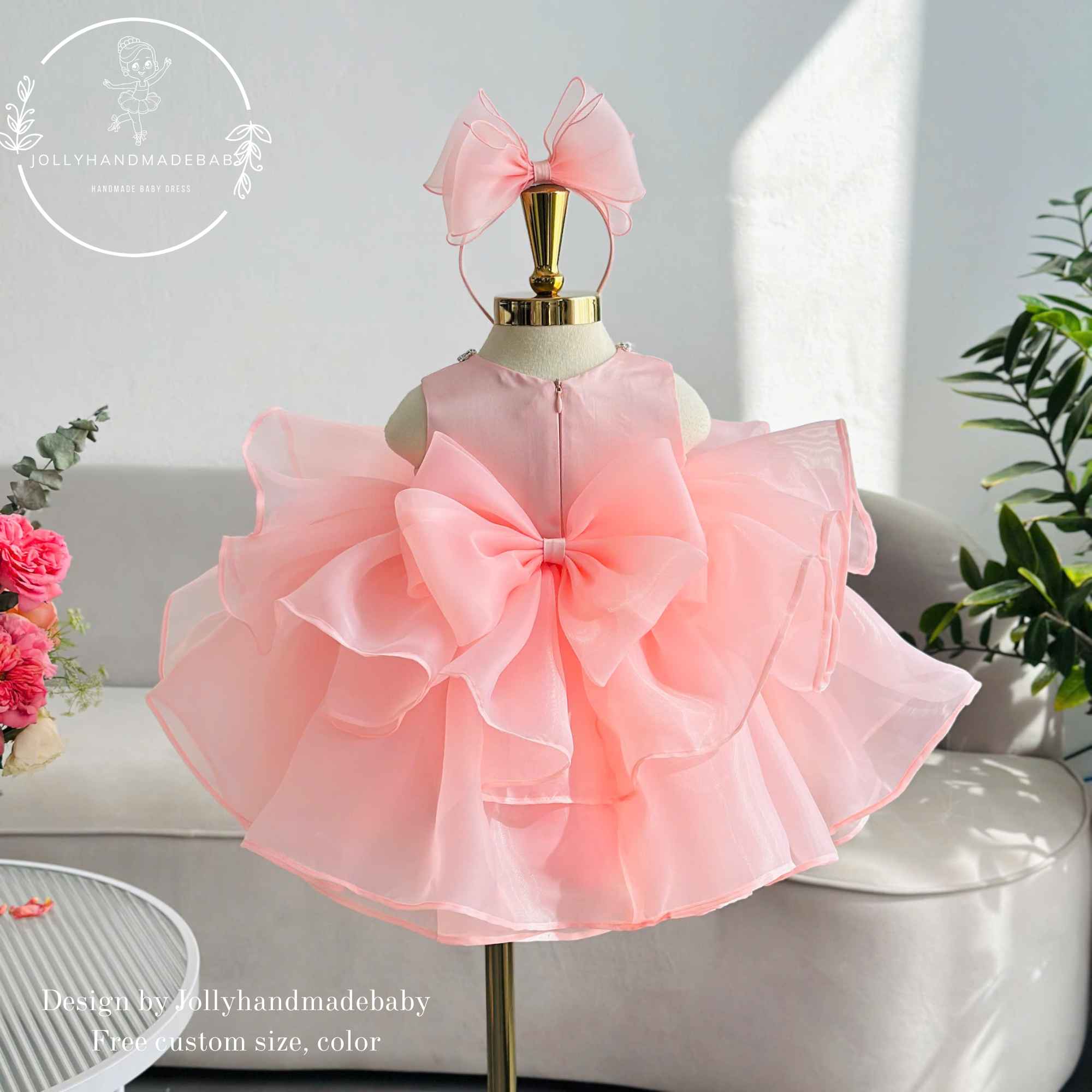 Deep Peach Baby Girl Dress, Flower Girl Dress, Toddler Birthday Dress, Organza Ruffle Dress with Big Bow, Coral Peach Party Dress