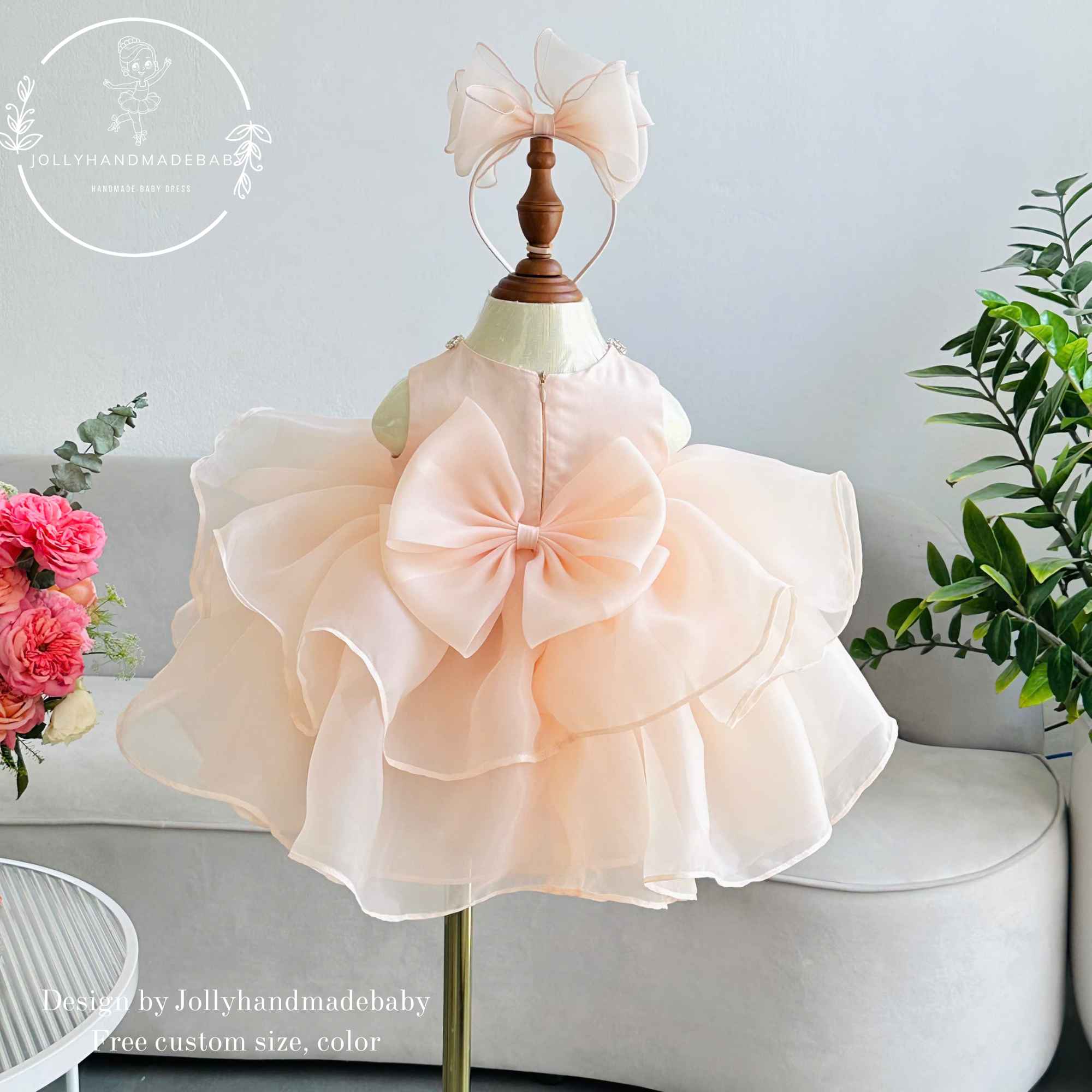 Peach Baby Girl Dress, Flower Girl Dress, Toddler Birthday Dress, Organza Ruffle Dress with Big Bow, Elegant Baby Party Dress