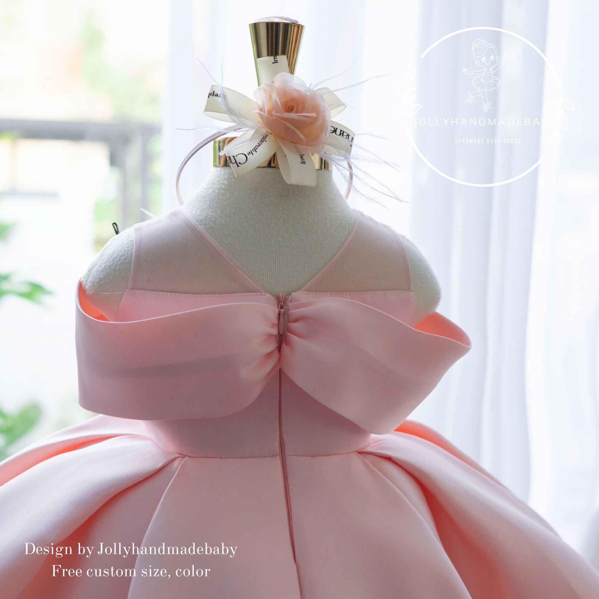 This handmade off-shoulder dress features a soft pink tone, structured bodice, and a voluminous skirt that creates a stunning princess silhouette. The delicate 3D flower detail adds charm and uniqueness, making it perfect for special occasions.
