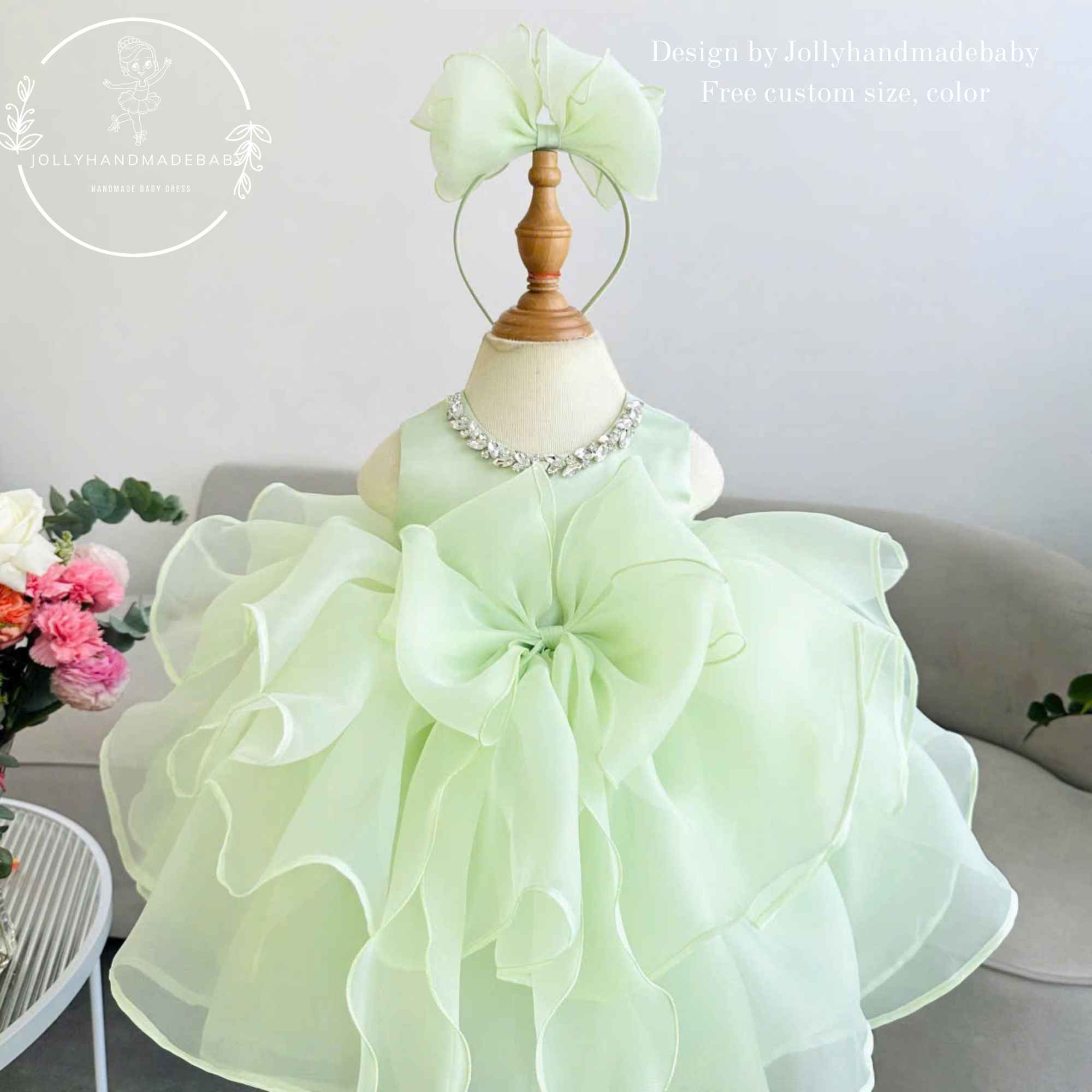 Like a little princess from a dreamy garden, this sage green dress brings a calm, natural beauty that feels both magical and timeless. The airy layers of organza gently flow with every movement, while the oversized bow adds a charming and graceful statement.