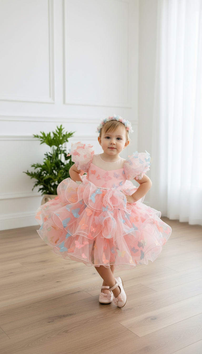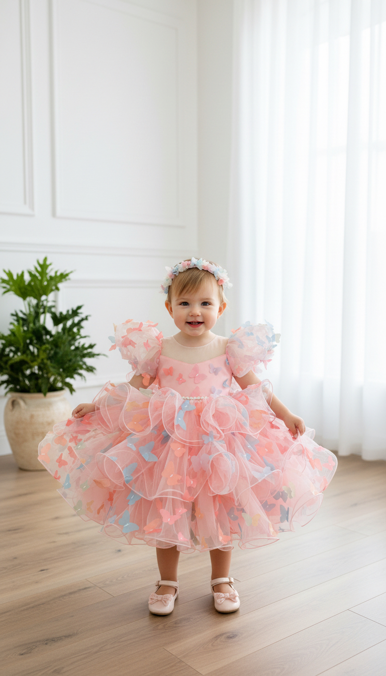 It began with a simple idea: to capture the wonder of childhood in fabric. Butterflies, with their delicate wings and graceful movements, became the heart of the design. They symbolize transformation, freedom, and innocence—everything a little girl embodies as she grows.
