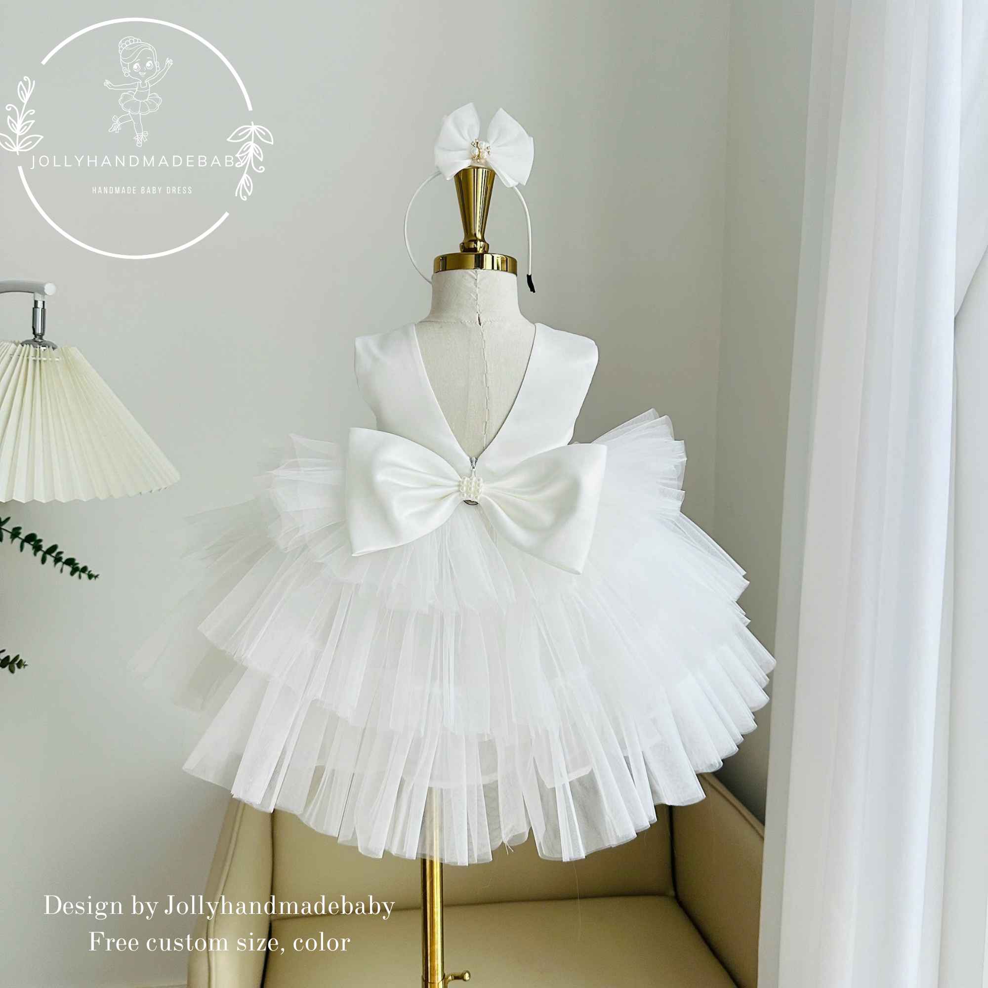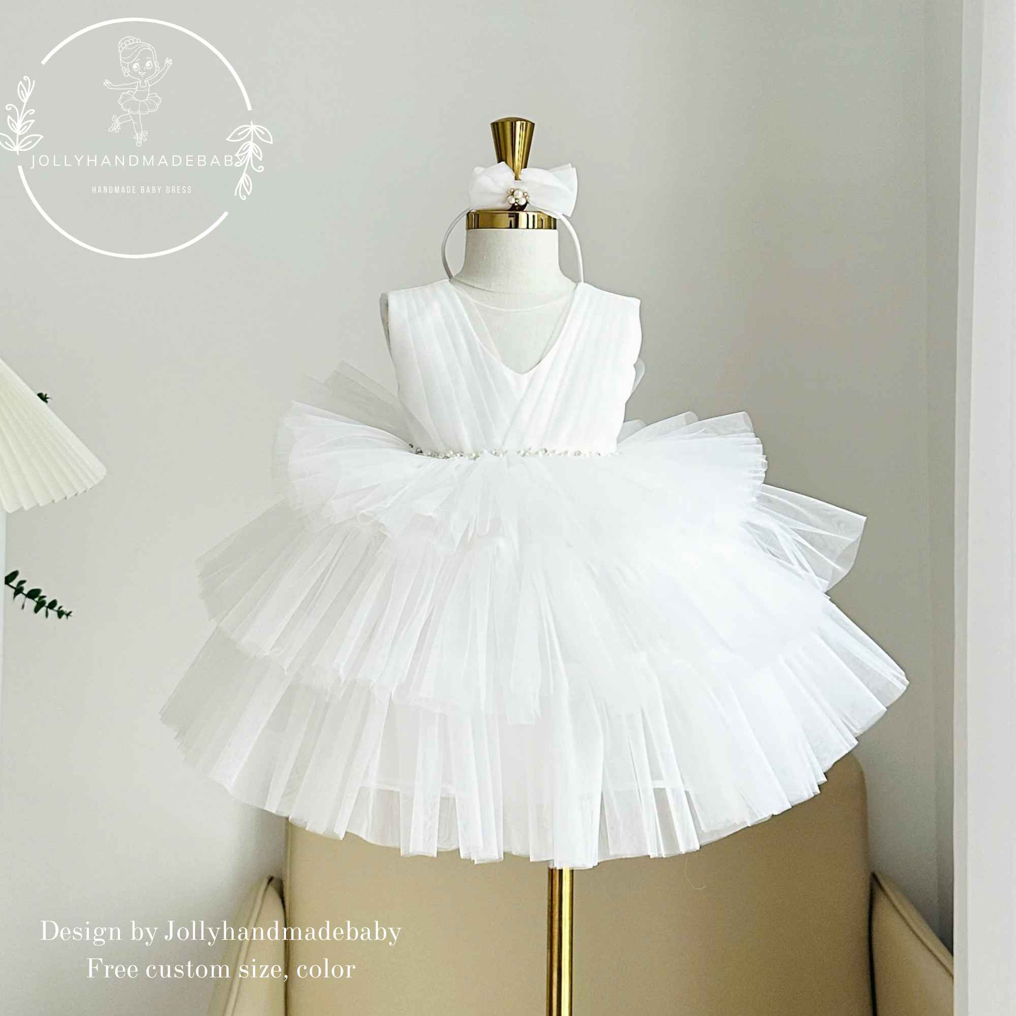 White Baby Girl Christening Dress Tulle Baptism Dress Puffy Sleeve Flower Girl Dress Toddler Princess Dress Holy Ceremony Outfit