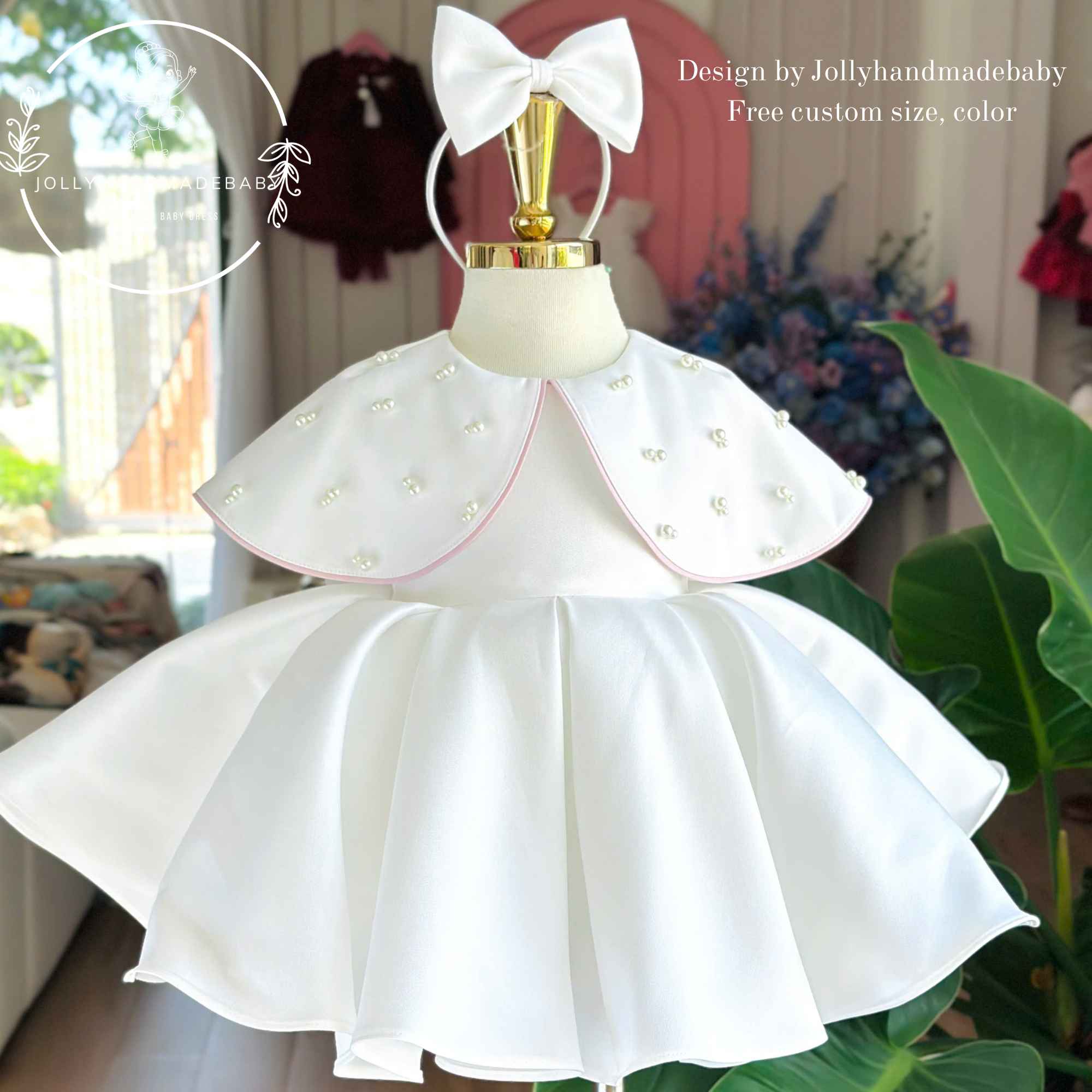 A dreamy white dress designed to make your little one shine in the most delicate and elegant way. This handmade piece features a soft, voluminous skirt paired with a beautifully crafted pearl-embellished cape, creating a timeless and graceful silhouette.