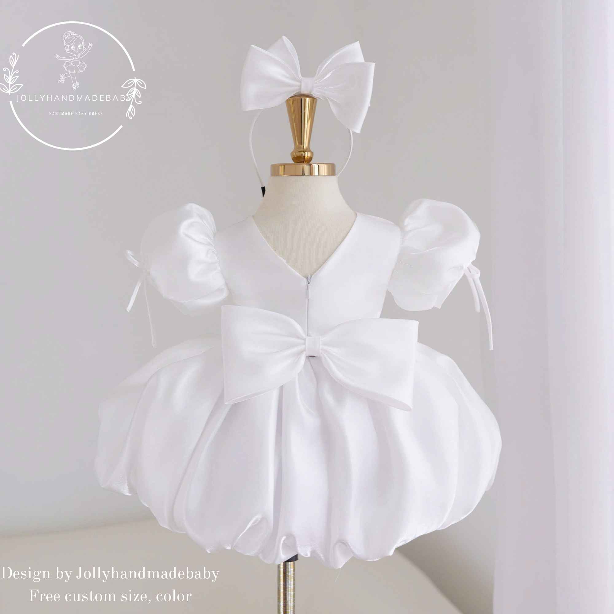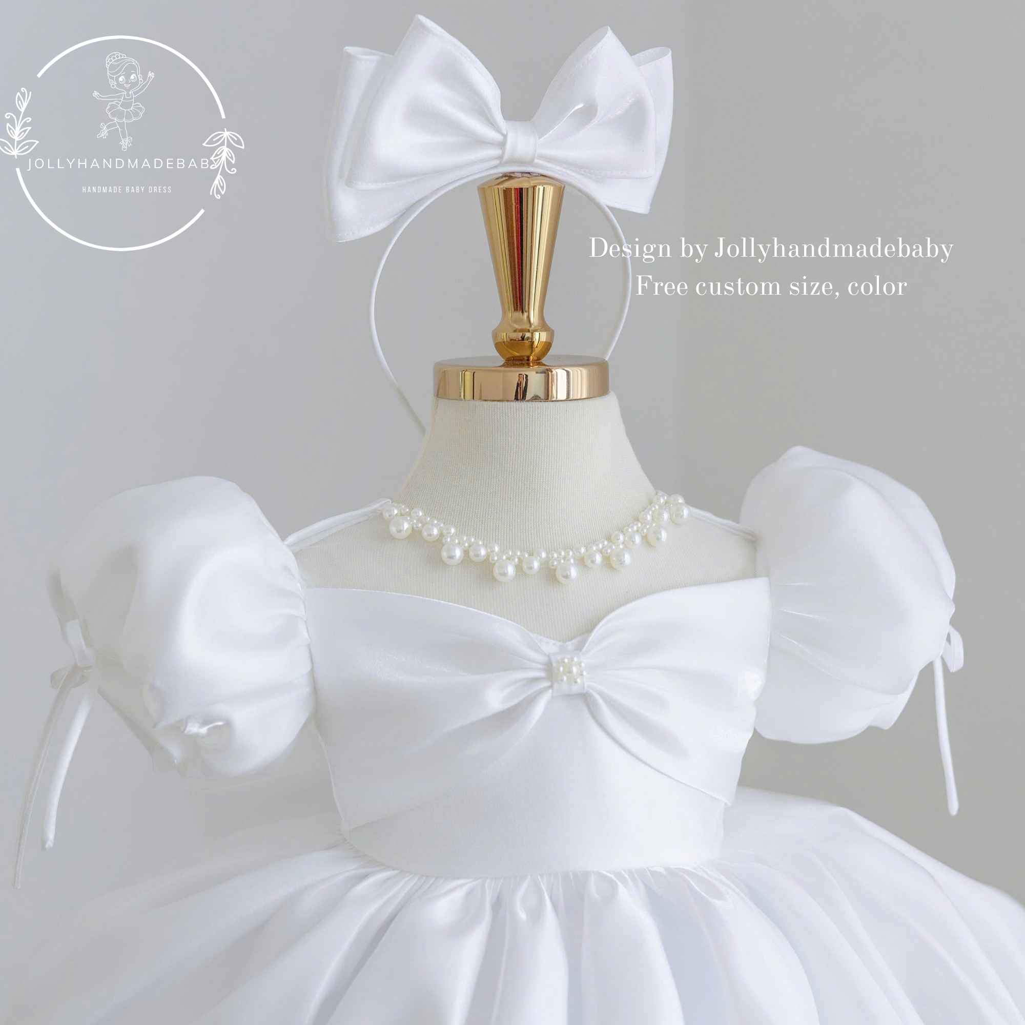 White satin baby girl princess dress with puff sleeves, pearl neckline and bow bodice, handmade toddler party dress with matching headband.